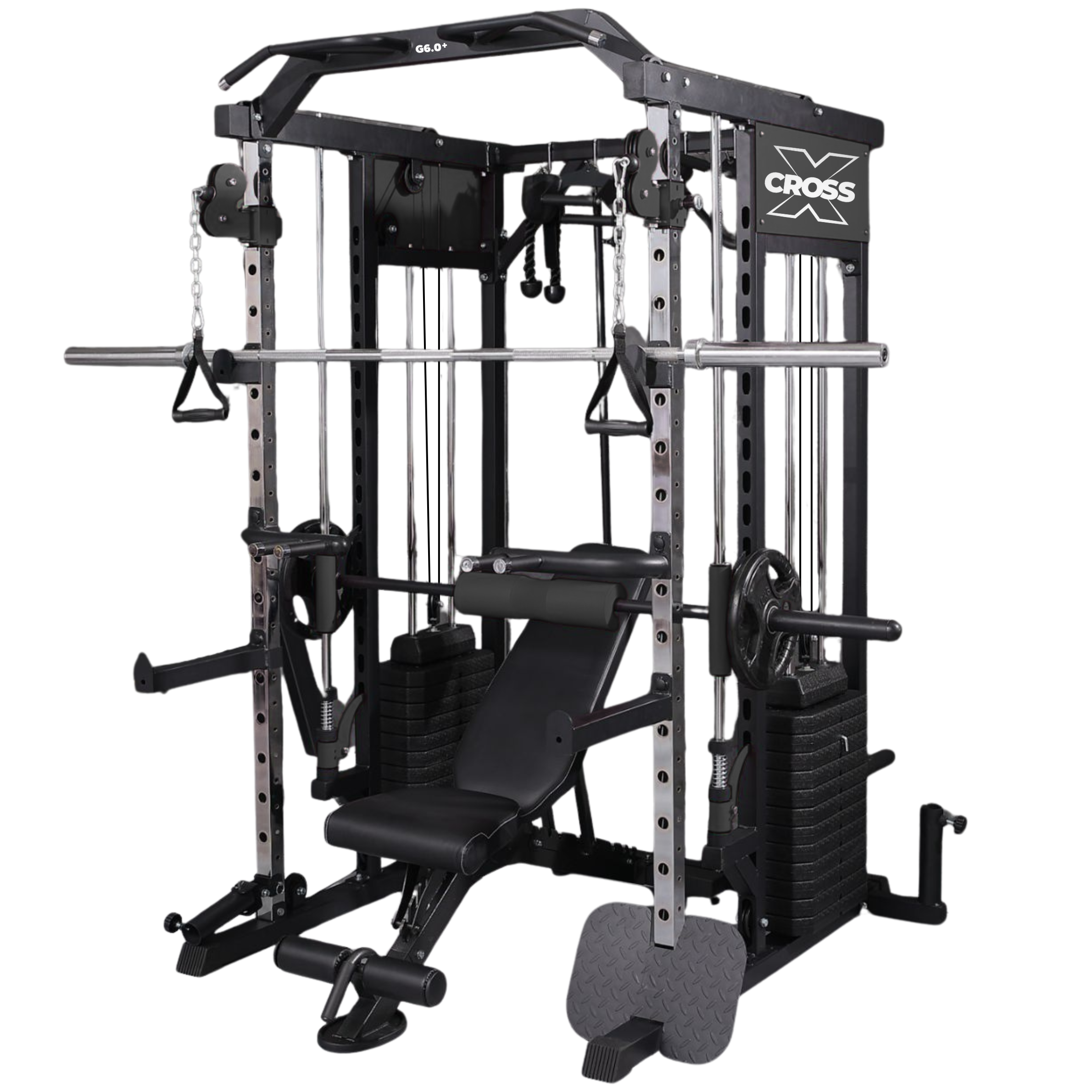 You can perform hundreds of exercises. The core of an all in one trainer includes compound lifts (squats, bench presses, deadlifts via rack pulls) using the power rack/Smith machine, isolation movements (bicep curls, tricep pushdowns, flyes) via the cable system, and specialised lower body training (such as the leg press). Add a simple bench and you unlock full-body workouts.